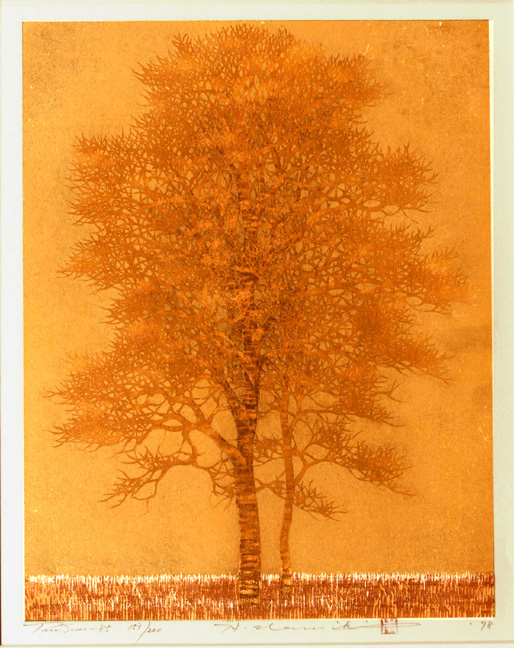 Tree Scene 85 (Gold) by Hajime Namiki Original wooodblock print, signed and numbered in pencil. Edition of 200 1998 Image size: 11 1 /2 x 9 in. Pristine condition