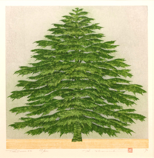 Green pine (Tree Scene 63) by Hajime Namiki Original wooodblock print, signed and numbered in pencil. Edition of 200 1996 Image size: 10 1/4 x 10 1/4 in. Pristine condition This print is in the Collections of the New Orleans Museum of Art