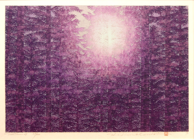 Lavender Forest, (Tree Scene #69), by Hajime Namiki Original wooodblock print, signed and numbered in pencil. Edition of 200 1997 Image size: 10 1/2 x 15 1/4 in. Pristine condition This print is in the Collections of the Art Institute of Chicago.