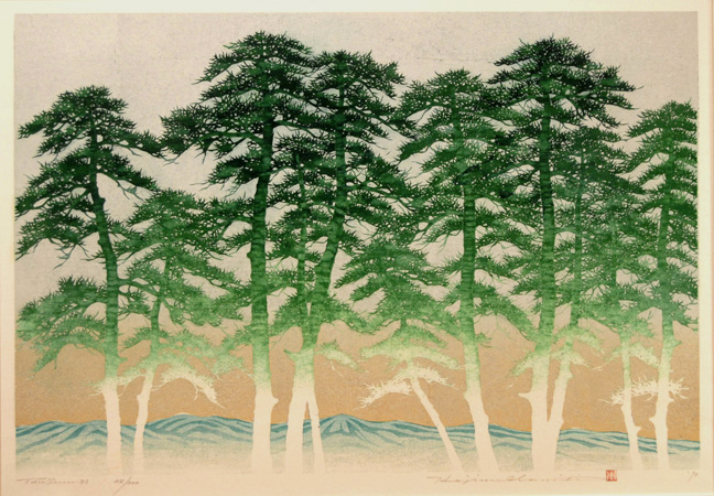Line of Trees by Hajime Namiki Original wooodblock print, signed and numbered in pencil. Edition of 200 1998 Image size: 13 3/4 x 10 3/8 in. Pristine condition This Print is in the Collection of the Los Angeles County Art Museum.
